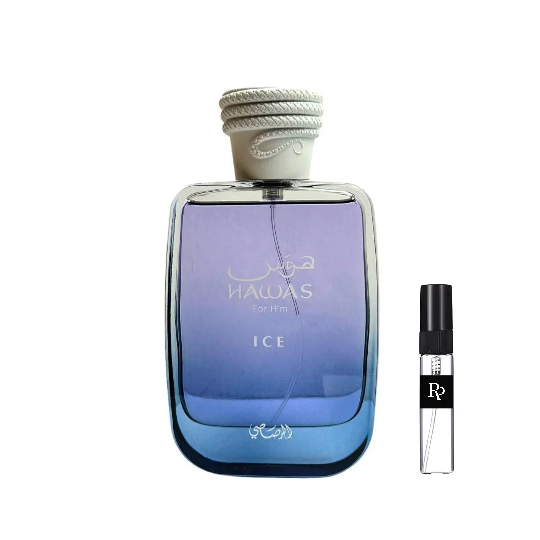 Hawas Ice for Him de Rasasi es una fragancia de la familia olfativa Aromática para Hombres. Esta fragrancia es nueva. Hawas Ice for Him se lanzó en 2023. Las Notas de Salida son manzana, limón italiano (lima italiana), bergamota de Sicilia y anís estrellado; las Notas de Corazón son ciruela, flor de azahar del naranjo y cardamomo; las Notas de Fondo son almizcle, ámbar, trozos de madera a la deriva y musgo.